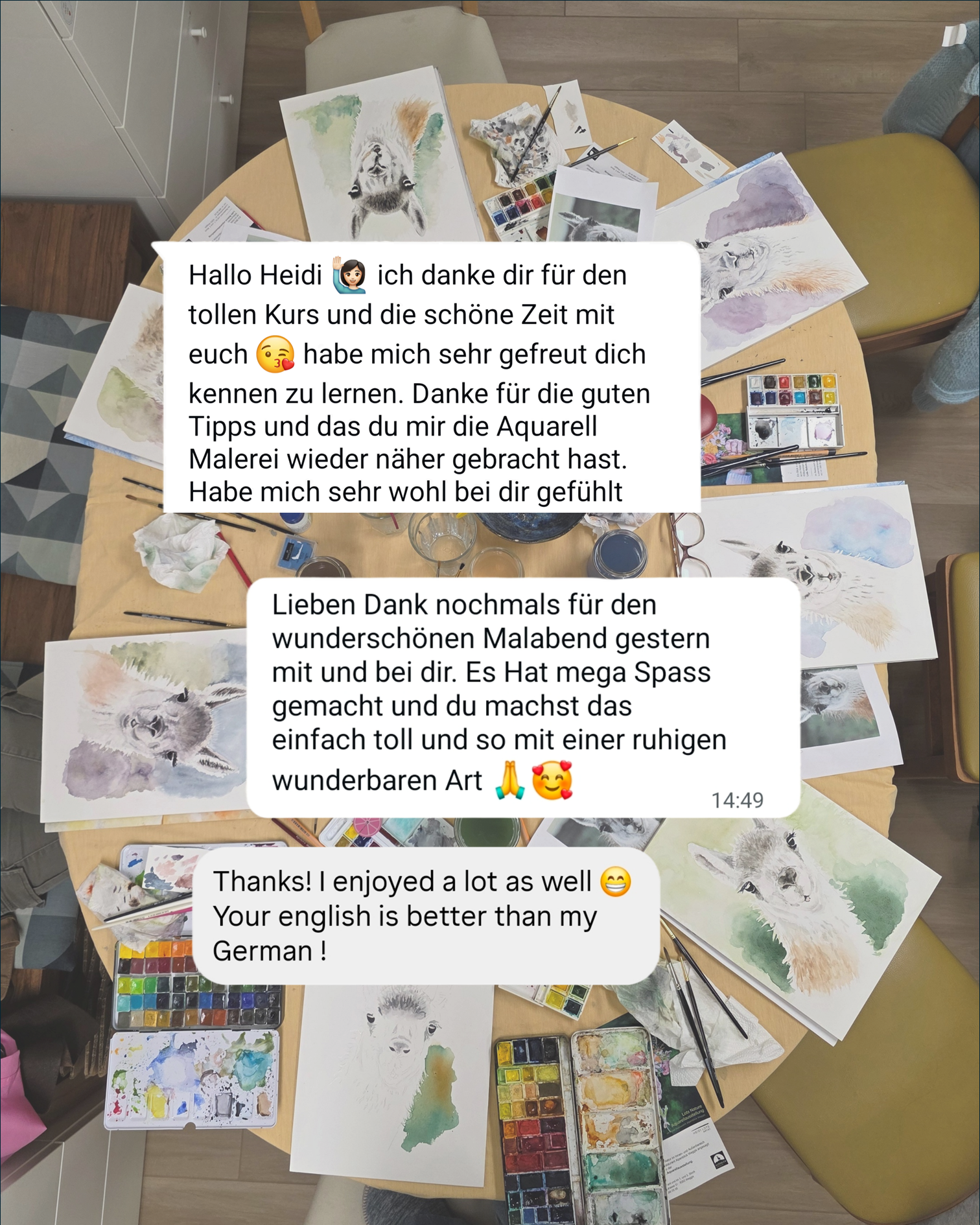 Ich möchte mir kurz Zeit nehmen, um euch von Herzen zu danken. Ihr macht diese Community zu etwas ganz Besonderem. Es ist jedes Mal ein Highlight für mich, so viele von euch in meinen Aquarell-Workshops persönlich zu treffen. Diese kreativen Runden bedeuten mir unglaublich viel. Jedes Treffen, jedes Bild ist anders! Gemeinsam ausprobieren, Techniken teilen, lachen, lernen und einfach in die Farben eintauchen.