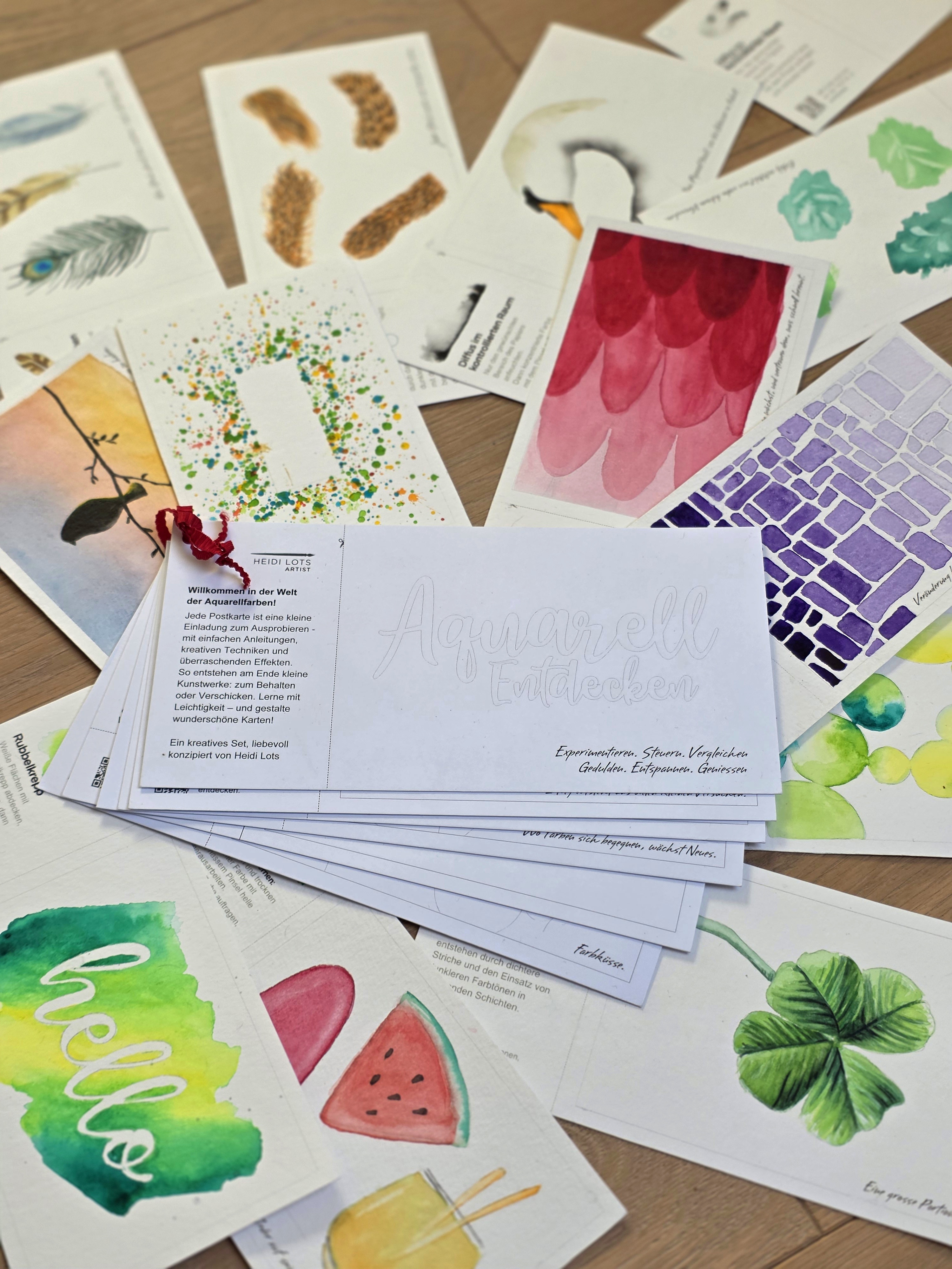 Willkommen in der Welt der Aquarellfarben! Mit meinem Aquarell-Postkarten-Set wird kreatives Ausprobieren ganz leicht, jede Karte lädt dich ein, neue Techniken zu entdecken und überraschende Effekte zu erleben.